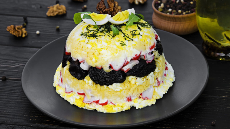 Как приготовить салат «Черный жемчуг» с крабовыми палочками